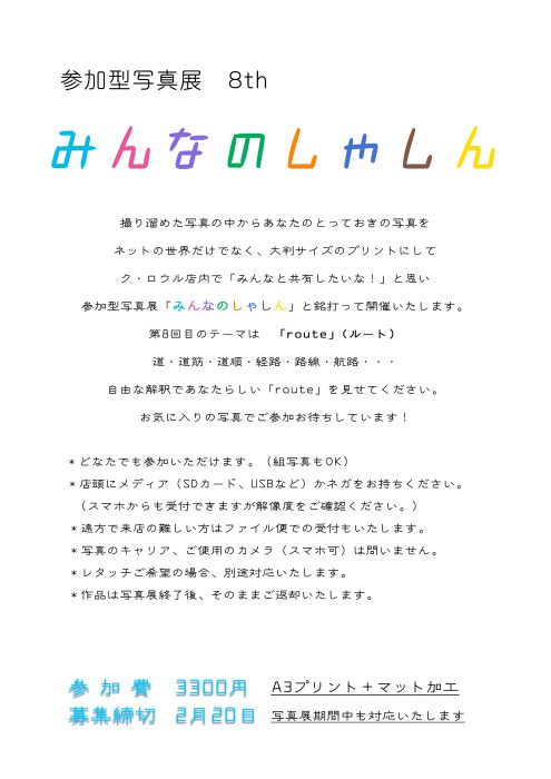 『みんなのしゃしん』8th 募集開始です! 2026年01月18日 お待たせしました! 『みんなのしゃしん』の応募を開始いたします。 今回の開催はなんと!8回目。 少しづつですが、皆様に認知されつつあるかなと感じています。 今回のテーマは「route」(ルート) みなさまそれぞれ感じたままの表現をお待ちしております!